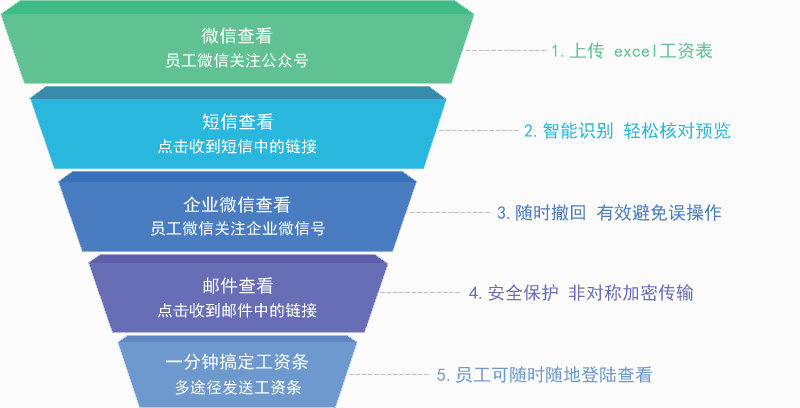 通过微信、邮箱、企业微信、短信一键发送,助力HR轻松快速生成工资条信息发布。